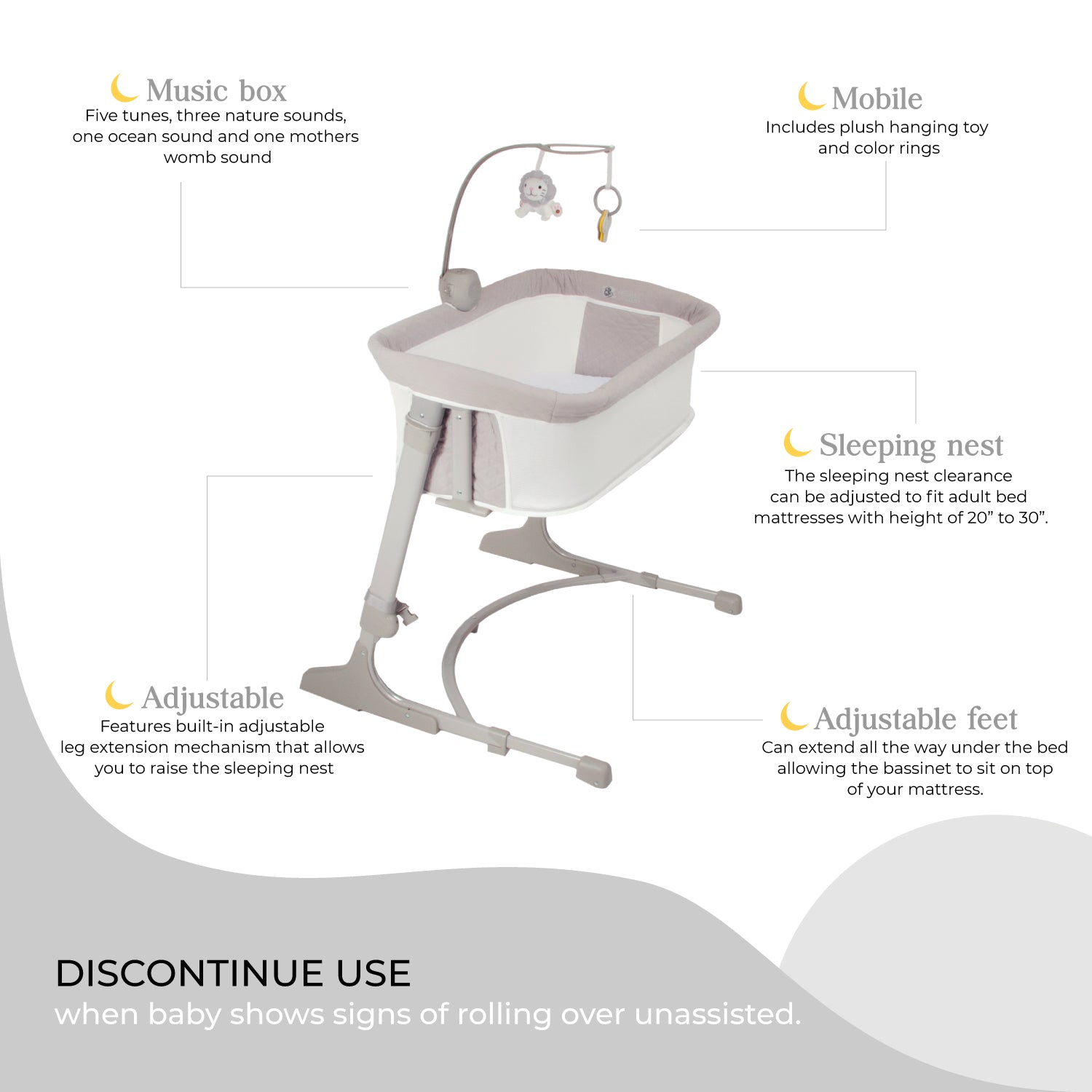 Flexible Feet: Extend fully under the bed so the bassinet can sit on top of your mattress, or retract to fit close to platform or floor-level beds.