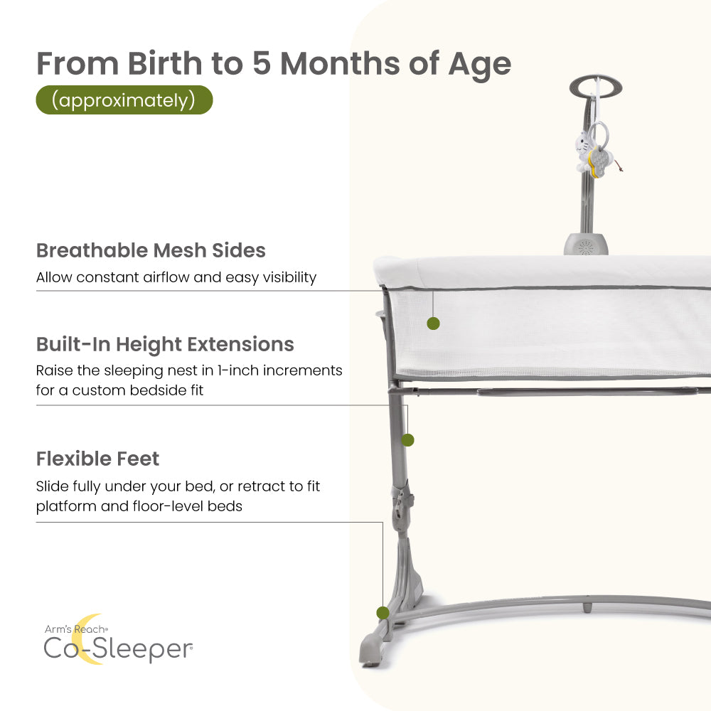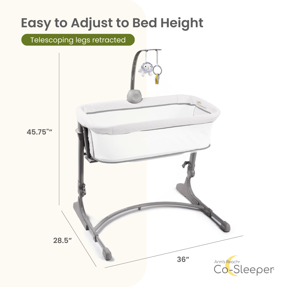 Designed to be adjustable in height, the Arm’s Reach Versatile Co-Sleeper® Bassinet fits all types of beds, perfect as a bedside bassinet for small spaces and varied bed heights.