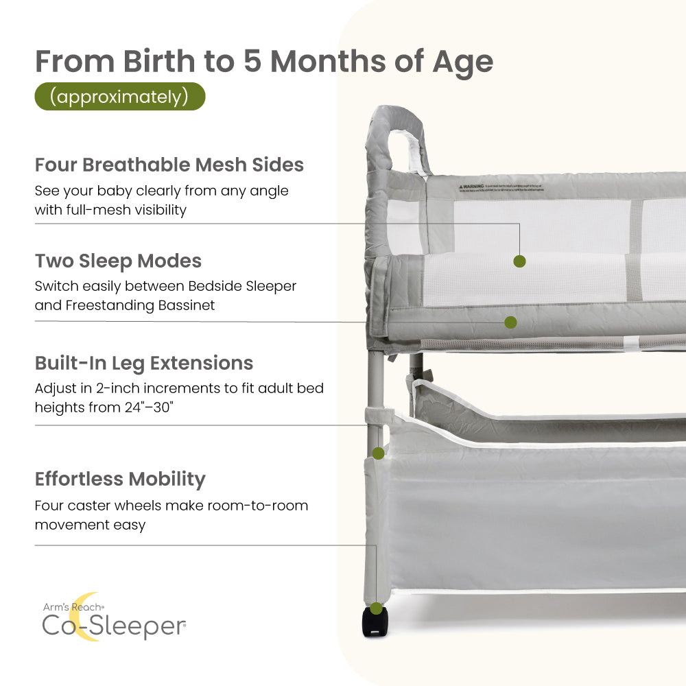 Designed for maximum visibility, the Clear-Vue® Co-Sleeper® bassinet allows you to see your baby at all times. Like all of our Arm’s Reach Co-Sleeper® bedside bassinets, it lets you and your baby sleep comfortably next to each other from day one in a bedside bassinet setup. Reach over to draw your baby close for feeding, comforting, and bonding with this cozy sleeper and baby bedside bassinet.
