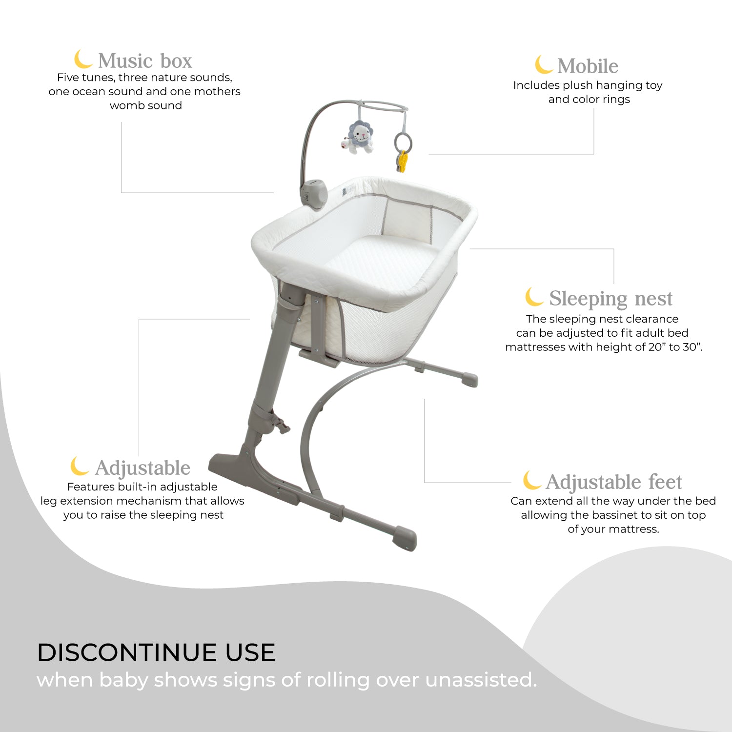 Flexible Feet: Extend fully under the bed so the bassinet can sit on top of your mattress, or retract to fit close to platform or floor-level beds.